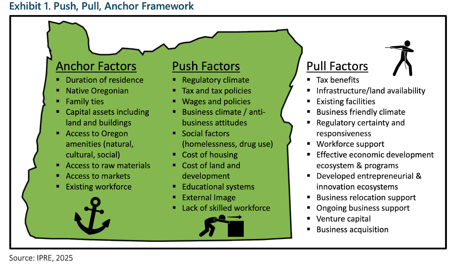 In a study performed by the University of Oregon for Business Oregon, they surveyed 393 traded-sector businesses and performed over 30 interviews with businesses and economic development organizations. They then put together the anchor factors (why businesses stay), push factors (whats pushing businesses away), and pull factors (whats pulling businesses away). I’ll include their graphic below: