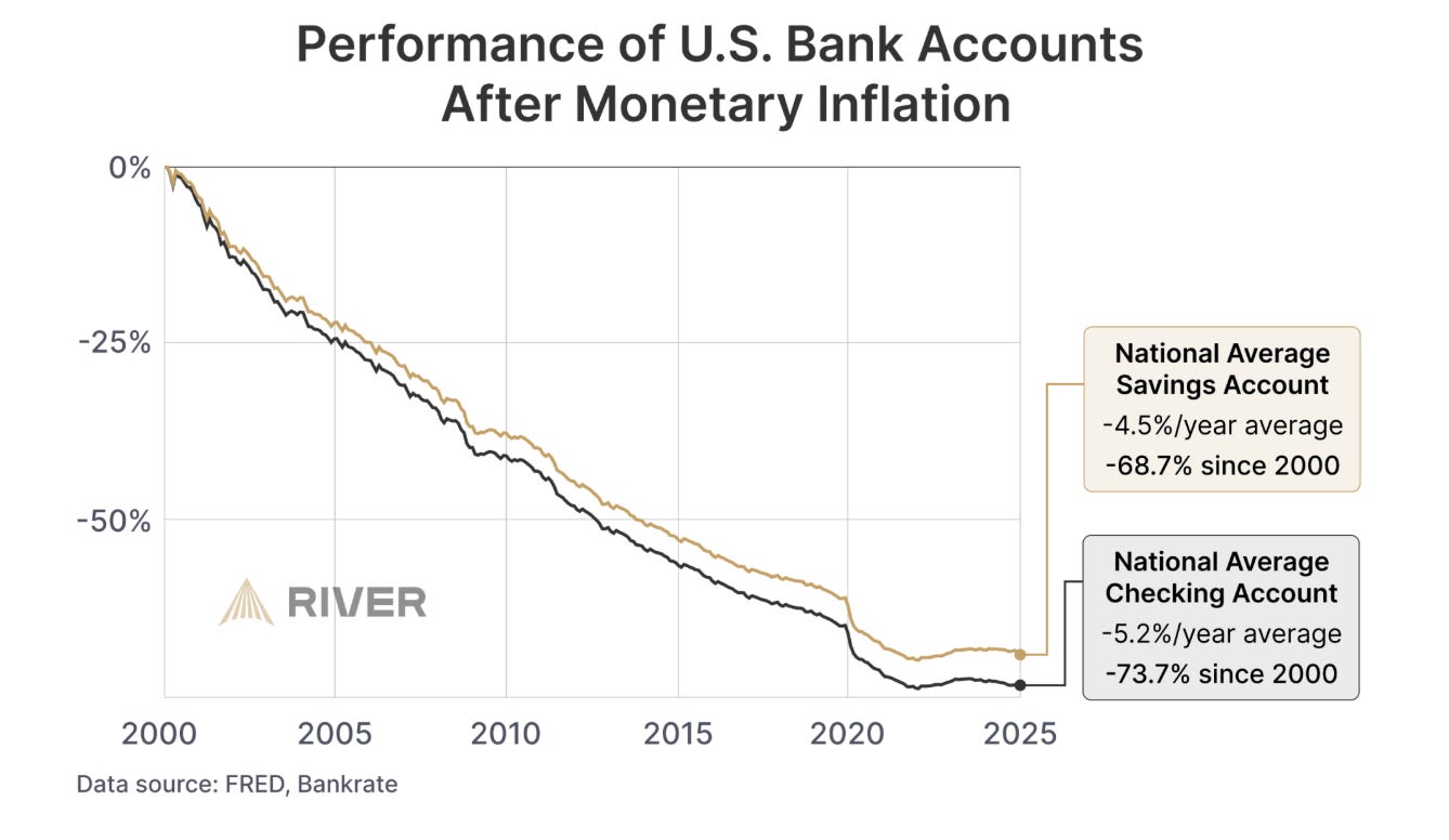 Average US bank account savings have been eroded by nearly 70% since 2000.