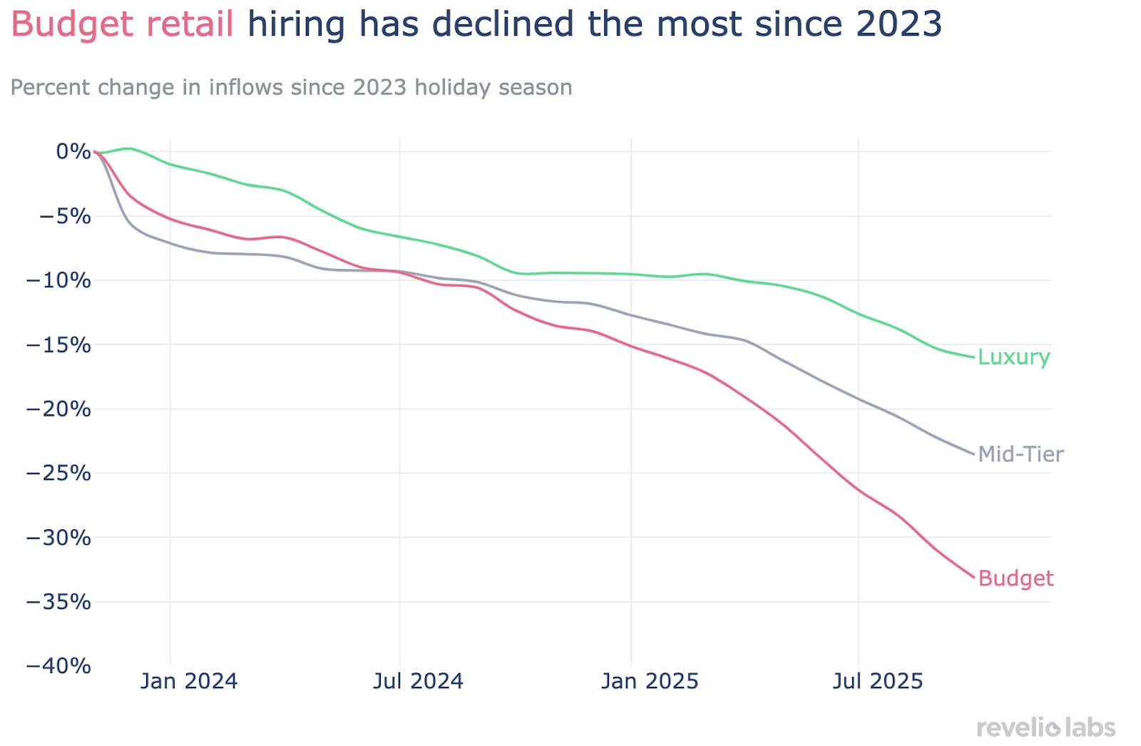 Revelio Labs (which reports on private and public jobs) reported 9,000 jobs lost in November, with active job postings declining by 1.9% month-over-month. Education and Healthcare were the only sectors to add significant jobs. Entry-level roles highly exposed to AI (meaning the tasks can likely be automated) have declined by over 40% since January 2023, demonstrating early impacts of AI adoption.