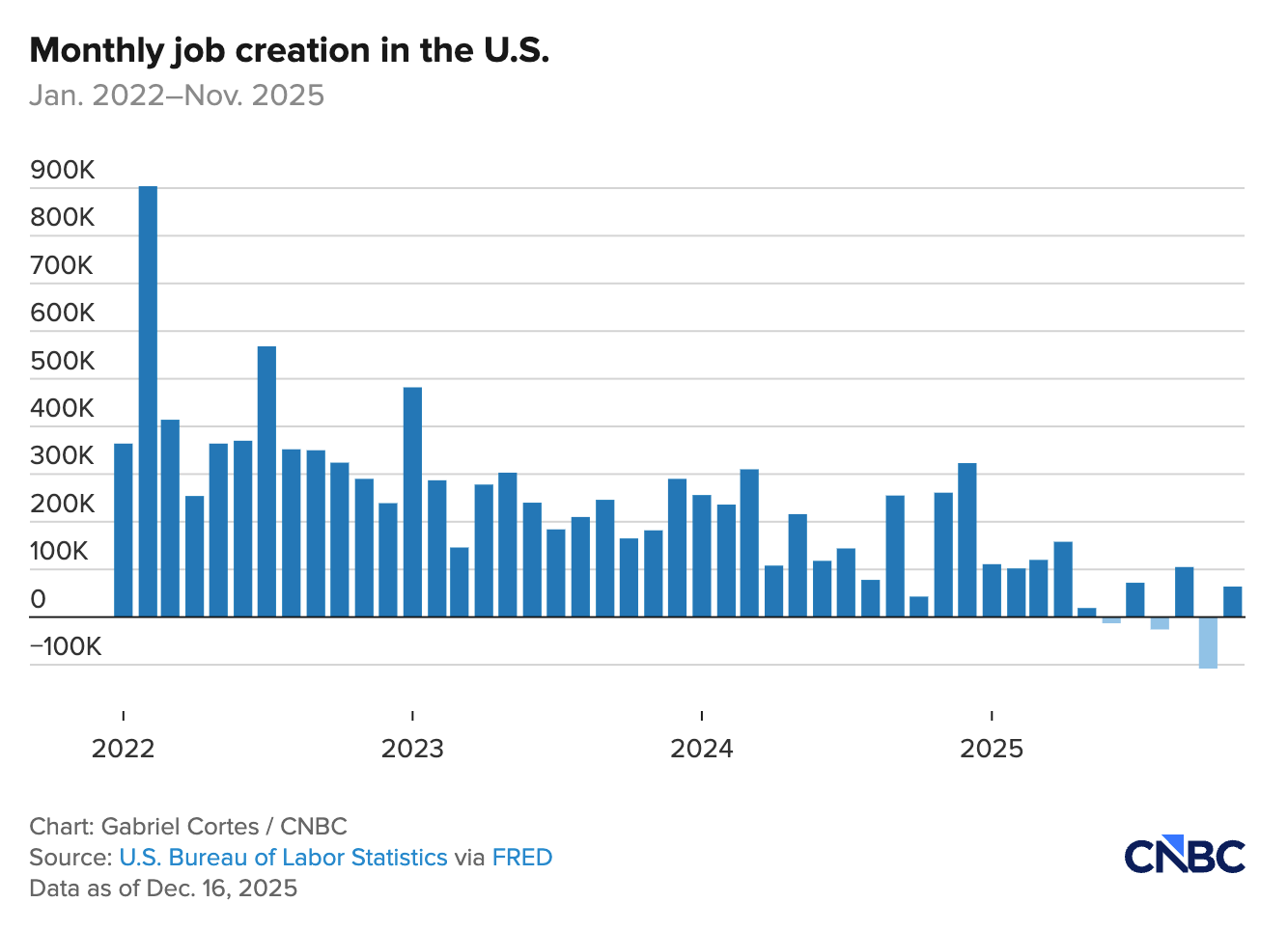 The Fed’s chose to lower the federal interest rate to 3.5-375% to address labor market issues, but they don’t anticipate lowering the rate for another few months as they use a wait-and-see approach for more accurate data to come out. Christopher Waller, a candidate for the next Fed Chair — which will be determined sometime soonish hopefully — shared sentiments about how everyone is afraid for their jobs in 2026. Couldn’t agree more, Waller.