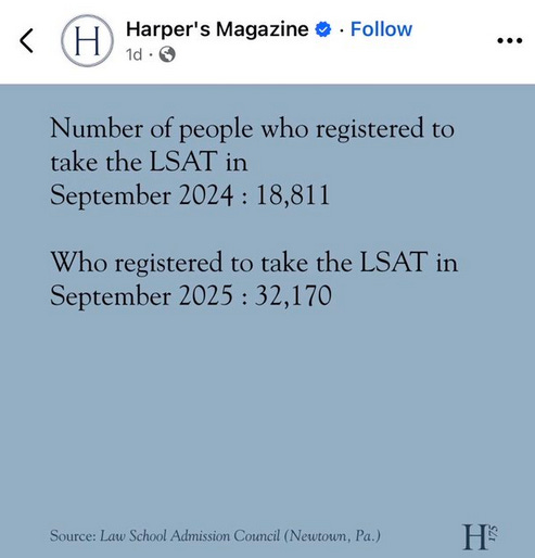 Data for law school admissions for this year show a 30% increase in applicants from this time last year. Harper’s Magazine also released numbers for September 2024 and September 2025 LSAT registrations, showing a large uptick.